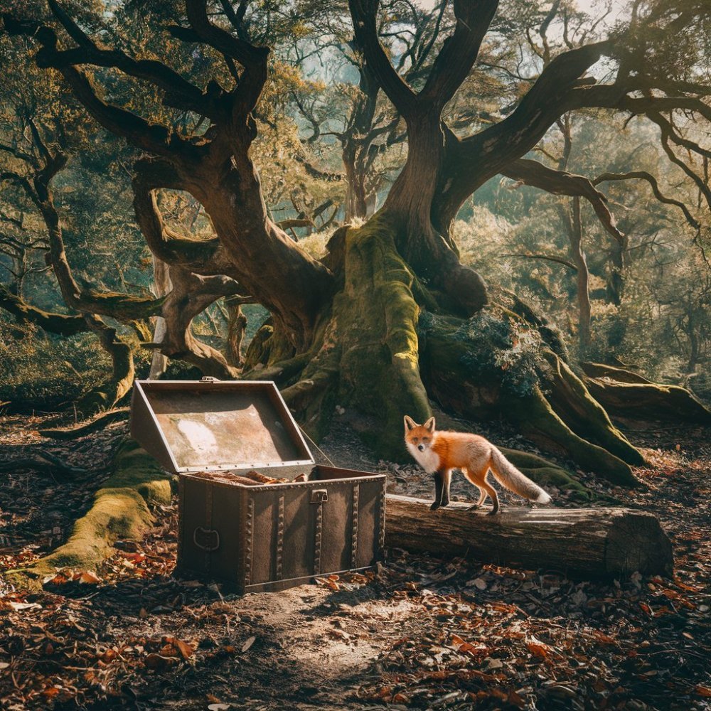 Na okraji velkého, starého lesa, kde stromy šuměly tajemstvími minulosti, žila chytrá liška jménem Sofia. Sofia byla známá svou zvídavostí a milovala dobrodružství. Jednoho dne, když skákala mezi kořeny starých dubů, narazila na starou, rezavou skříňku. 'To musí být poklad!' pomyslela si vzrušeně.