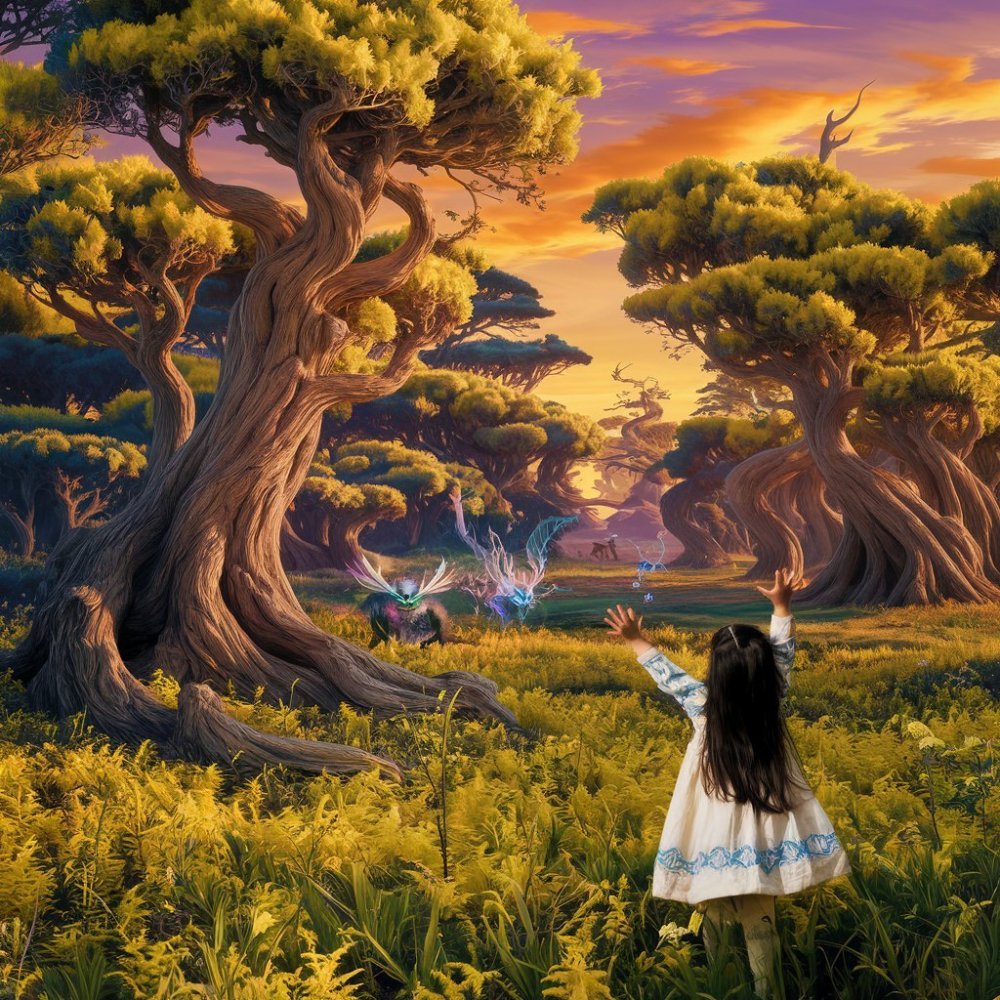 Dobrý večer, milovníci pohádok! 🌟 Na dnešnom obrázku môžete vidieť tajomný les pri západe slnka, kde naša mladá hrdinka objavuje staré stromy a stretáva zázračné bytosti. Aké dobrodružstvá si myslíte, že ju čakajú medzi týmito kúzlami prírody? 🌲👧 #rozpravky #dobranoc #priroda #detskepribehy