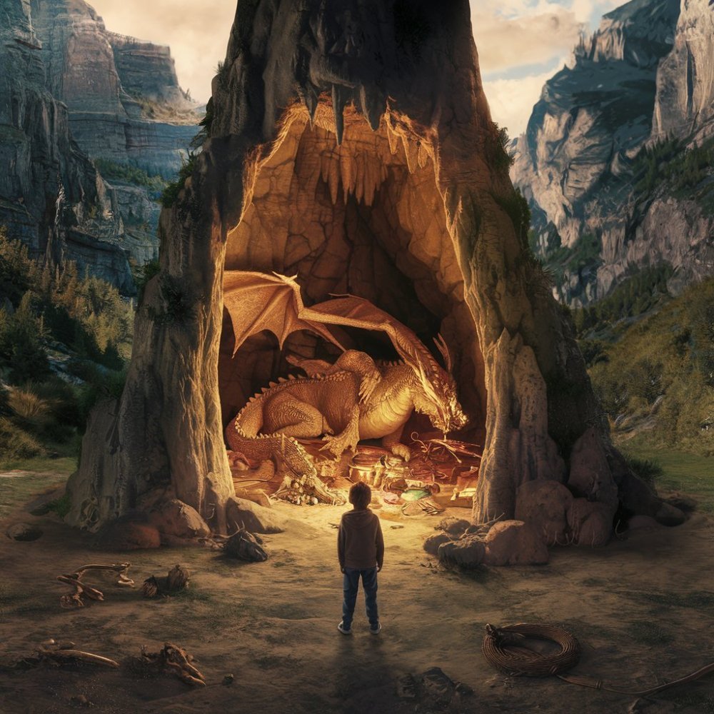 Jakub našel vstup do jeskyně, ze které se linula záře. Srdce mu bilo vzrušením a trochou strachu, když vstoupil dovnitř. Uvnitř objevil obrovského, ale zdánlivě klidného draka, který ležel na hromadě pokladů. Drak otevřel jedno oko a pozorně si Jakuba prohlížel.