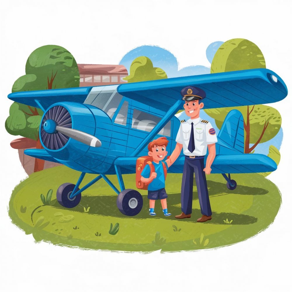Jakub vyběhl ven a nemohl uvěřit svým očím. Na trávníku stálo obrovské, zářivě modré letadlo s nápisem 'Dobrodružství volá!'. U dveří stál muž v pilotní uniformě, který se na Jakuba usmíval. 'Ahoj Jakube, jmenuji se Kapitán Vítr a jsem tady, abych tě vzal na cestu kolem světa!'